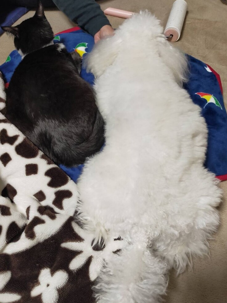 我が家には4歳のわんこ(男の子)がいるのですが、初日きたそうそう猫パンチして、ふわふわしたしっぽを追いかけていました。子供とおもちゃで遊び疲れて、子供・わんこ・りくで爆睡していました。
