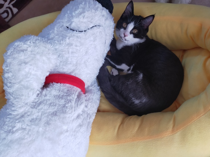 幸い、気が付いて治療を開始したタイミングがよかったのか、お薬のおかげか今は、元気にすごしています。最近では、わんこと一緒に同じおもちゃを追いかけたり、わんこのハウスにはいってごはんを除いたり、家の中の探検隊です。