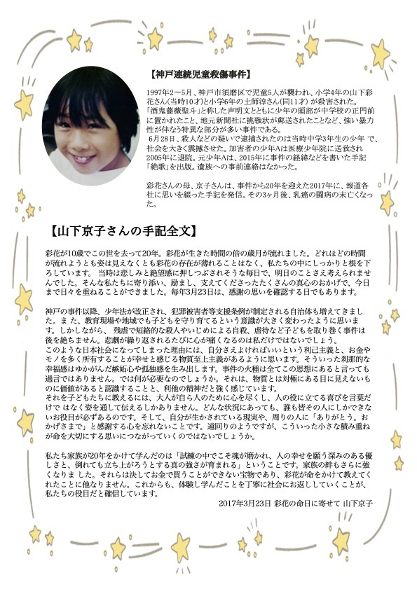 1997年に起きた神戸連続児童殺傷事件の被害者、山下彩花さん(当時10才)の母、故・山下京子さん。