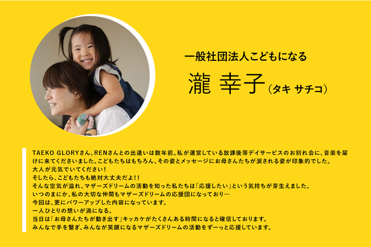 『日々がんばるママたちが輝いて、その輝きで子どもたちや家族を照らしたい』というTAEKOの思いを「マザーズドリーム」大成功という形で叶えてあげたい。