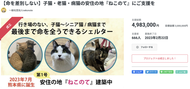この度は、私たち一般社団法人nekonoteのプロジェクト「【命を差別しない】子猫・老猫・病猫の安住の地『ねこのて』にご支援を」にご協力いただき、誠にありがとうございます。
