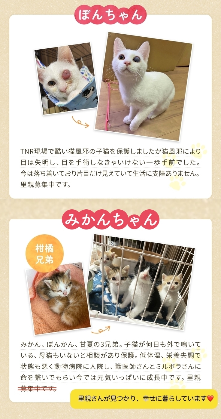 このプロジェクト準備中に緊急保護した猫ちゃん達とその後をご紹介します。