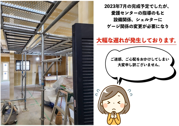 - 動物取扱業取得に向けて申請を進めてきましたが、内装で不備指摘を受けたため、本プロジェクトでのご支援金を使用させていただき、改修後に改めて申請予定となっております。時期的目処は2024年7月31日となっております。(2023年12月1日現在)