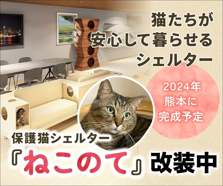 しかし、増やさないための活動を私達が率先して行い、熊本県・殺処分ゼロに向けての一連の活動を一貫して行えるスペースがあれば、より効率的に運営が進められると考え、保護猫シェルター第一号として安住の地『ねこのて』を作ることを決意。