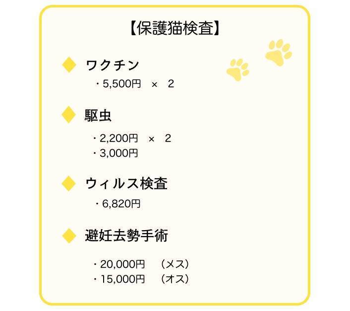 保護してから里親さんに譲渡するまで病院への通院費や健康チェックなどの医療費、フード代やトイレ用品代などがかかります。お世話にかかった費用の一部をご負担いただいています。