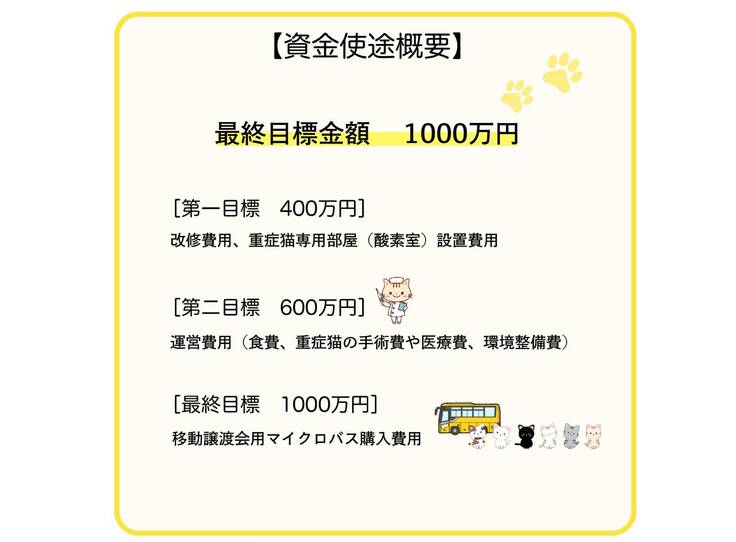 第1弾のプロジェクトで約500万円のご支援金をいただき、自己資金も加えてシェルターの建設、及び防音・防臭対策は一旦完了しておりますが、今回の第2弾のプロジェクトでは許認可取得にあたって必要な内装の改修、及び追加的な防音防臭対策、そして重症猫専用部屋(酸素室)の設置に係る費用と運営費、そして最終的には譲渡会などのイベント時に使用する車両の購入費用に関して支援を募りたい思います。