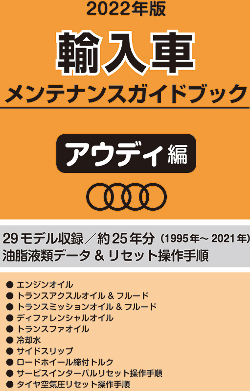 2022年版 輸入車メンテナンスガイドブック アウディ編書籍について■輸入車のメンテナンスデータ25年分をまとめました!■待望の輸入車データブックを遂に発刊しました!油脂液類データ ▪エンジン型式毎にエンジンオイル容量・SAE粘度を収録 ※オイルフィルター&ドレンプラグ締付トルク値も分かります。 ▪ATF、2ペダルMTオイル、MTオイル、デフ、トランスファーオイル 冷却水の容量・指定油脂・交換要領等タイヤ&ホイールデータ ▪横滑り量の例外的取扱車両のサイドスリップ数値 ▪ロードホイール締付トルク値初期化リセット作業 ▪エンジンオイル交換後のサービスインターバルリセット手順 ▪タイヤ空気圧充填後のリセット手順 収録車両:1995年~2021年の約25年分。 2022年5月時、旧型・生産終了車両。発行日: 令和4年6月発行サイズ/ページ数: A5版/104ページ
