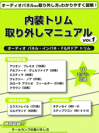 内装トリム取り外しマニュアル Vol.3〈オーディオパネル特集〉書籍について本書は「オーディオパネル取り外し」に特化した一冊で、テレビアンテナ取り付けのために必要となるAピラーの取り外しも収録しています。また、参考収録として「初めてのナビ取り付けガイド」を巻末に収録しています。[収録範囲]国産乗用車222車種(約10年分)発行日: 平成26年9月発行ISBN: ―サイズ/ページ数: A4判 352ページ