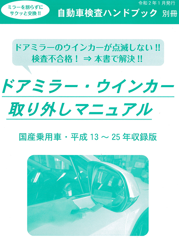 ドアミラー・ウィンカー 取り外しマニュアル 国産乗用車平成13年~25年収録版書籍について平成13年頃から国産乗用自動車に装着され始めた、後写鏡(ドアミラー)に内蔵された方向指示器(ウインカー)の取り外し方法を①ミラー部の取り外し、②カバーの取り外し、③ウインカーの取り外し、の順にまとめたマニュアルです。平成13年~平成25年に発売された170車種収録しました。手順を誤ると新たな部品の手配(納車日の変更)、余計な出費がかさんでしまいますので、予定通り見積・納車できるよう本書をご活用下さい。発行日: 令和2年1月発行ISBN:サイズ/ページ数: A4判/160ページ