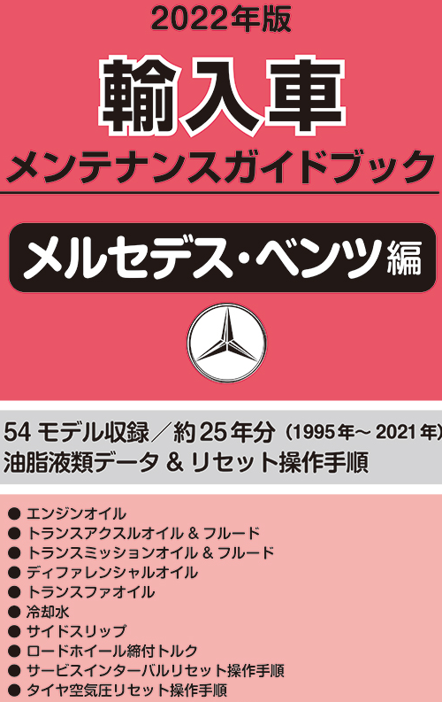 2022年版 輸入車メンテナンスガイドブック メルセデス・ベンツ編書籍について■輸入車のメンテナンスデータ25年分をまとめました!■待望の輸入車データブックを遂に発刊しました!●油脂液類データ ▪エンジン型式毎にエンジンオイル容量・SAE粘度を収録 ※オイルフィルター&ドレンプラグ締付トルク値も分かります。 ▪ATF、2ペダルMTオイル、MTオイル、デフ、トランスファーオイル 冷却水の容量・指定油脂・交換要領等 ●タイヤ&ホイールデータ ▪横滑り量の例外的取扱車両のサイドスリップ数値 ▪ロードホイール締付トルク値●初期化リセット作業 ▪エンジンオイル交換後のサービスインターバルリセット手順 ▪タイヤ空気圧充填後のリセット手順● 収録車両:1995年~2021年の約25年分。 2022年5月時、旧型・生産終了車両。発行日: 令和4年6月発行ISBN: ―サイズ/ページ数: A5版/268ページ