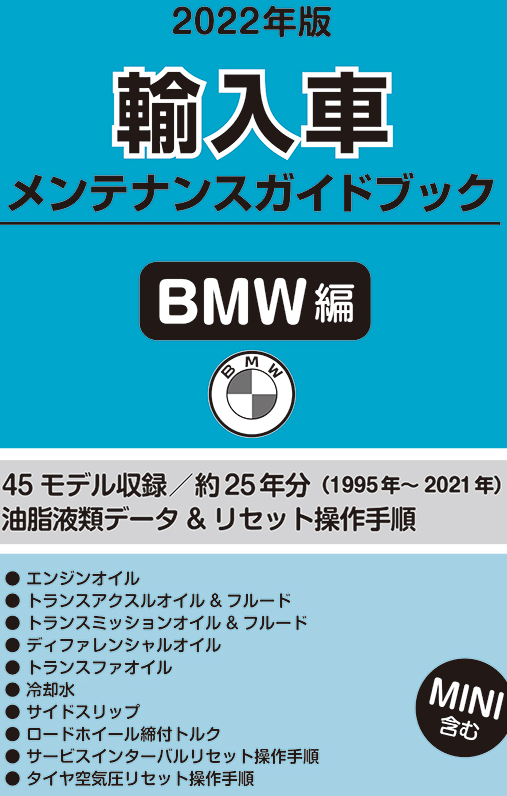 2022年版 輸入車メンテナンスガイドブック BMW編書籍について■輸入車のメンテナンスデータ25年分をまとめました!■待望の輸入車データブックを遂に発刊しました!●油脂液類データ ▪エンジン型式毎にエンジンオイル容量・SAE粘度を収録 ※オイルフィルター&ドレンプラグ締付トルク値も分かります。 ▪ATF、2ペダルMTオイル、MTオイル、デフ、トランスファーオイル 冷却水の容量・指定油脂・交換要領等 ●タイヤ&ホイールデータ ▪横滑り量の例外的取扱車両のサイドスリップ数値 ▪ロードホイール締付トルク値●初期化リセット作業 ▪エンジンオイル交換後のサービスインターバルリセット手順 ▪タイヤ空気圧充填後のリセット手順● 収録車両:1995年~2021年の約25年分。 2022年5月時、旧型・生産終了車両。発行日: 令和4年6月発行ISBN: ―サイズ/ページ数: A5版/232ページ