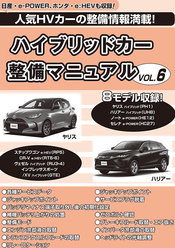 ハイブリッドカー整備マニュアル VOL.6書籍について本書は、現場でハイブリッドカーの整備に関する必要な情報にすばやくアクセスできるよう制作された、『ハイブリッドカー整備マニュアル』シリーズの6作目となります。今作はトヨタの人気車種の他に日産・e-POWER車、ホンダ・e:HEV、スバル車を収録いたしました。前作に引き続き、油脂類の交換量からフルードの取替方法、リレーロケーションなど現場に必要な情報がこの1冊にまとまっています。★収録車種★1.トヨタ・ヤリス ハイブリッド(PH1)2.トヨタ・ハリアー ハイブリッド(UH8)3.日産・ノート e-POWER(HE12)4.日産・セレナ e-POWER(HC27)5.ホンダ・ステップワゴン e:HEV(RP5)6.ホンダ・CR-V e:HEV(RT5・6)7.ホンダ・ヴェゼル ハイブリッド(RU3・4)8.スバル・インプレッサスポーツ/XV ハイブリッド(GTE)発行日: 令和3年10月発行ISBN: ―サイズ/ページ数: A4判/160ページ