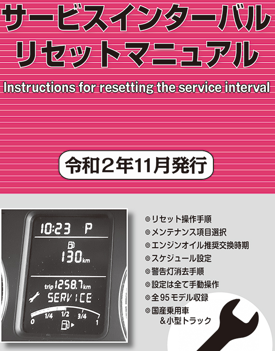 サービスインターバルリセットマニュアル(令和2年11月発行)書籍について■エンジンオイル交換後に行うサービスインターバルリセット手順を収録。 最近の車は、エンジンコンピュータでオイル交換距離を演算しています。 インターバルランプ点灯時は正しい操作でのリセット作業が必要です。タイヤローテーションや定期点検時期の設定も行える車両もあります。 ●作業交換後のリセット操作手順 ●メンテナンス項目選択(エンジンオイル・フィルタ等) ●エンジンオイル推奨交換時期設定 ●メンテナンス(入庫時期)スケジュール設定 ●インターバルを知らせる警告灯の消去手順 ●全95モデル収録(新旧問わず) ●国産乗用車・1BOX・小型トラック等 ※輸入車は未収録です。★故障診断機は使用せず簡単にリセット可能です!発行日: 令和2年11月発行ISBN:サイズ/ページ数: A5版/232ページ