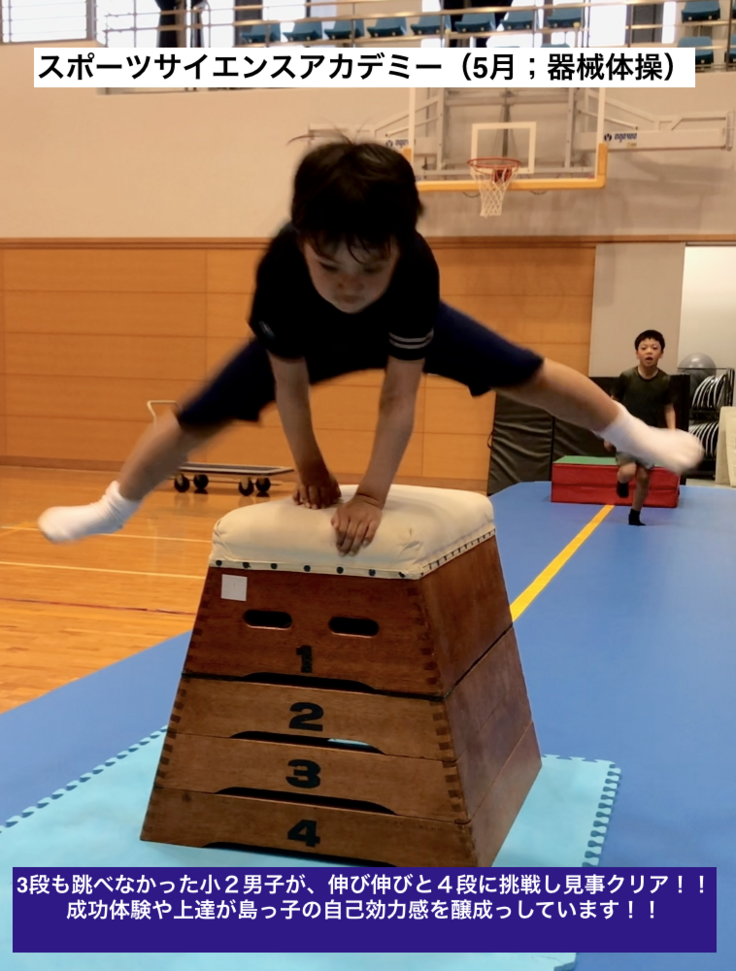肝心な運動スキルの習得では、写真にある小2男子の4段挑戦成功を皮切りに、側転や台上前転、前回り、逆上がりなど、クリアできない種目もありましたが島っ子全員が笑顔を絶やすことなく最後まで課題に積極的に取り組みやり切りました。