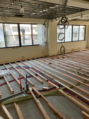 床下の木の枠の中を電気やLANのコードを通す管、水道管などの工事が進んでおりました。