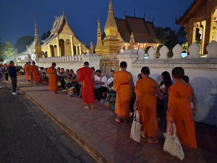 仏教信仰地として栄えたラオスの古都 / ルアンプラバンで体験した伝統の儀式「托鉢」は、早朝に僧侶が家々を練り歩き信者から食料を受け取り信者に功徳を積ませる修行である。