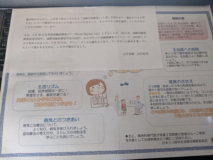 わたしの所属する教会の、全教会員に向けて、双極性障害(Ⅱ型)の理解を助ける資料が、他の教会における資料と合わせて、配布されました。