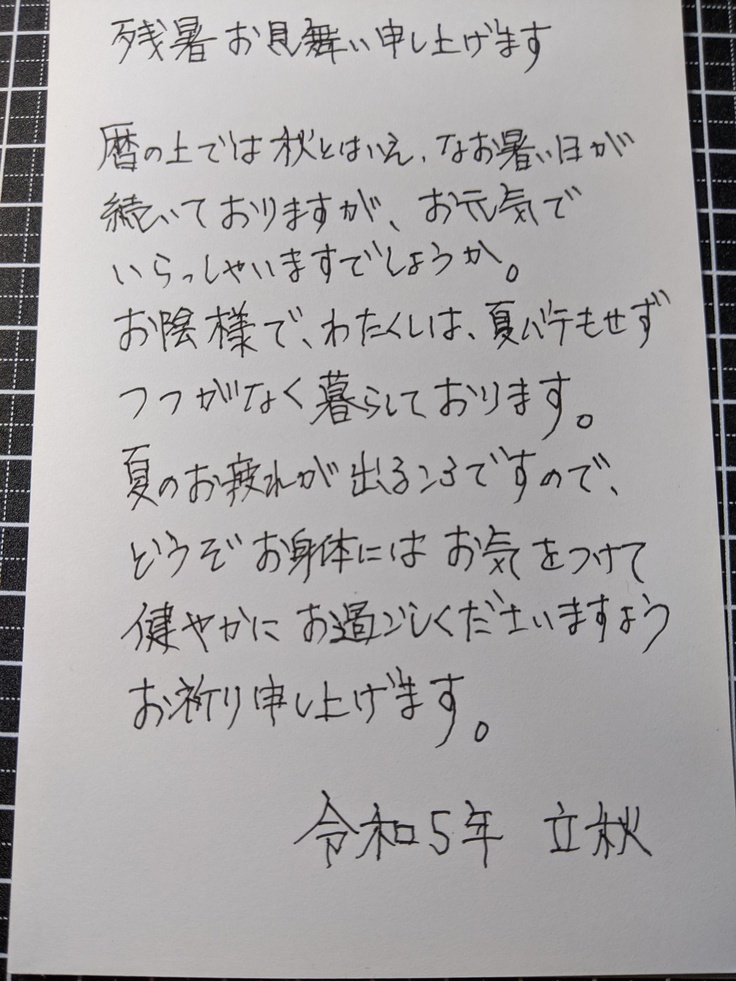 乱筆にて、皆さまには、大変恐縮なのですが、昨日、13通、全て、手書きを終えて、郵送も済ませました。9月7日までには必ず届くと思いますので、ギリギリ「残暑見舞い」にて、セーフです。