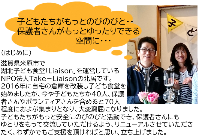 現在、コミュニティカフェやイベントを休日返上で開催し、みなさまの参加費やご飲食代をすべて「子ども食堂」運営への支援金として受け取らせていただいています。が、食材や消耗品にあてるのが精いっぱいな状態です。