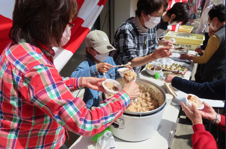 茶飯、茶団子、味真野茶を振る舞いました(手前から3人目、紺白チェックのエプロンが私です)