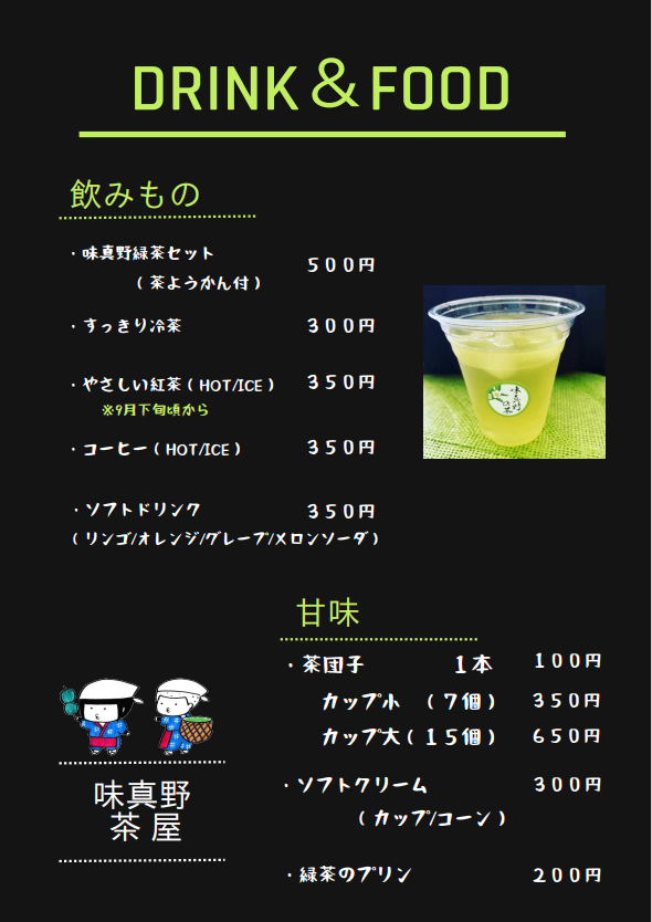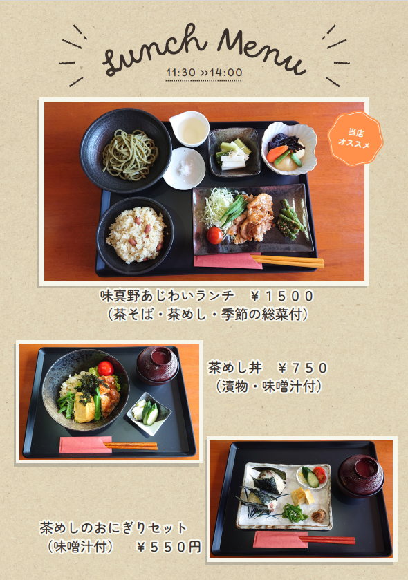 提供しているランチメニューの中でも「茶そば」「茶飯」「茶団子」「茶羊羹」「冷茶」など、味真野茶の特性に合わせて試行錯誤してまいりました。お近くにお越しの際にはぜひお立ち寄りいただければと思います。