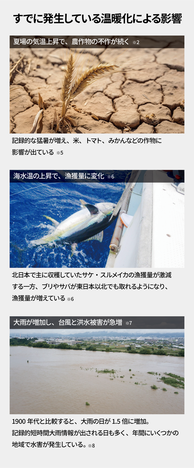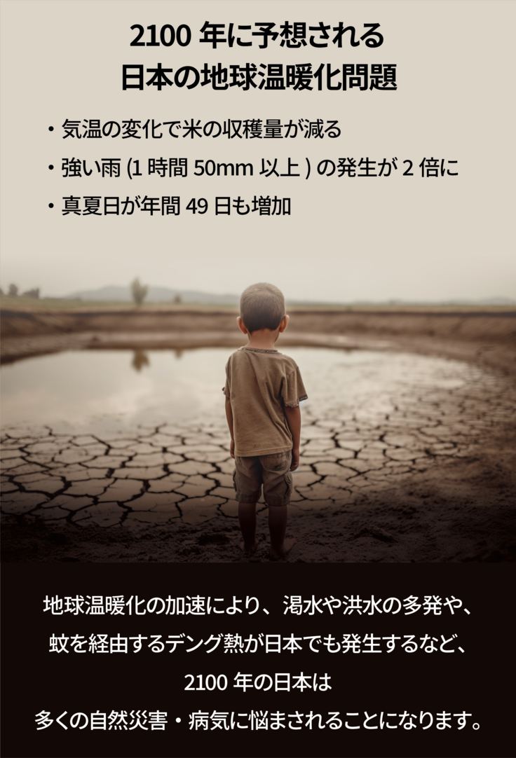 このまま地球温暖化が進行すると、日本でも多くの問題が発生すると言われています。