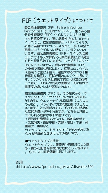 体調が一向に良くならない為、ネットで色々と調べていた事もあり、FIPについては知っていました。