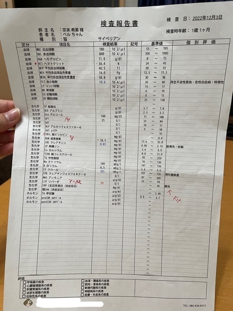 この日はすぐに分かる結果のみの診療でしたが、腹水も溜まっており、黄疸の数値も高いことから、FIP(ウエットタイプ)の可能性が高いだろうという診断でした。