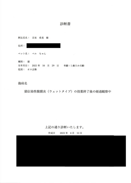 FIPを8割、9割寛解できる薬があると聞きすぐに治療を開始してもらいました。