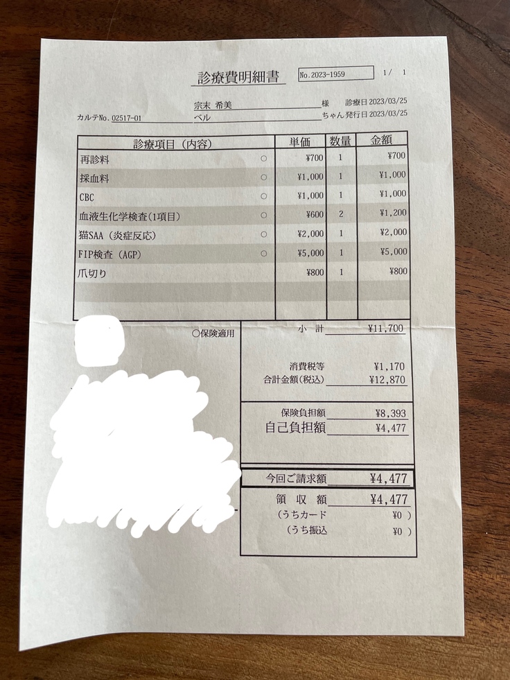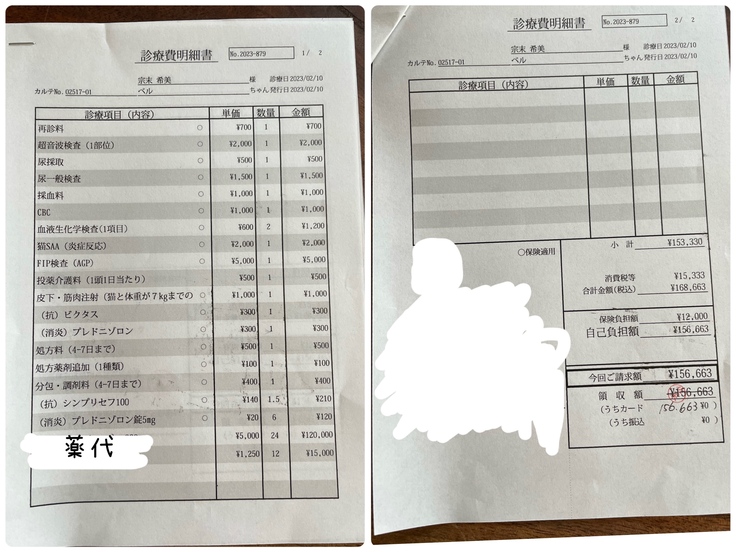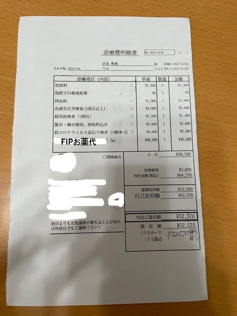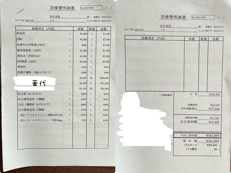 これまでも、FIPと分かるまでは毎日行きつけの病院へ通院し、点滴や注射などの治療を自己資金で賄ってきました。また、FIPの可能性が出てきてからは1時間以上かかる病院まで通っていました。