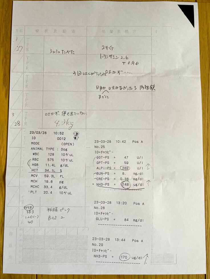 血液検査の結果アンモニアの数値が異常値のため、先天性門脈体循環シャントの疑いあり
