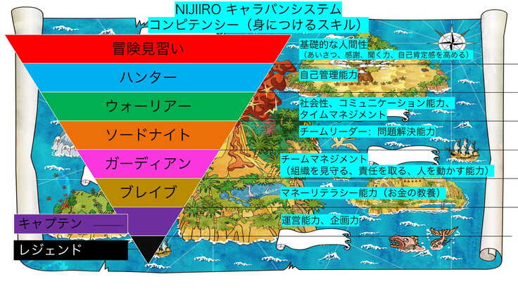 「挨拶・礼儀」などの基本的な社会性から始まり、荷物や時間の管理という「自己管理」、そして困っている人を助ける、人のいいところを見つけることなどを段階を追って習得していきます。