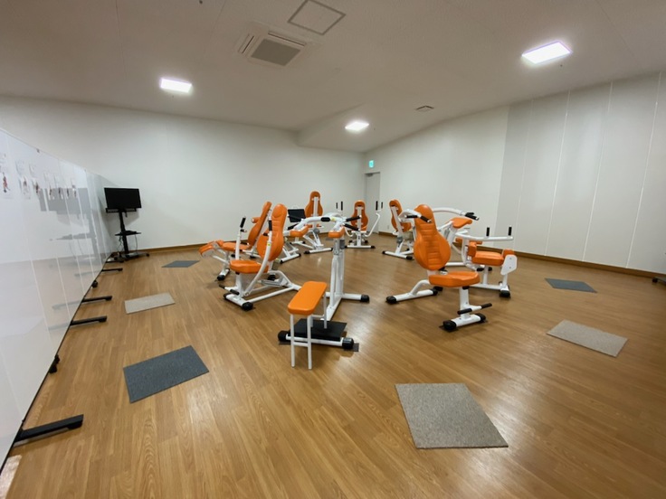 ジム面積は、約100坪です。大きく3部屋に分かれています。メインの運動である、サーキットトレーニングは、11台のマシンと有酸素運動の組み合わせです。