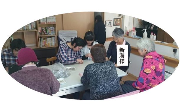 新海さん、写真は皆さんと一緒に安全ピンの内職のお仕事をしてくださっているところです。