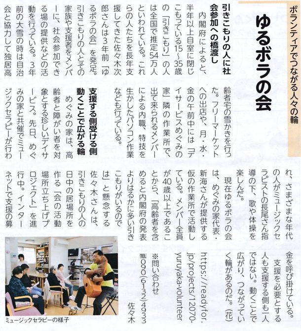 また5月5日の地域新聞にも我々の活動が紹介されております。この活動がきっかけで、新たな支援者も加わり、障がい者のシェアーハウスも始めることになり、準備をはじめています。同様にNPO立ち上げの準備にも入りました。まだまだ始まったばかりで、解決しなければならない、課題はたくさんありますが一歩一歩前進する所存でございます。今後ともご支援のほどよろしくお願い申し上げます。