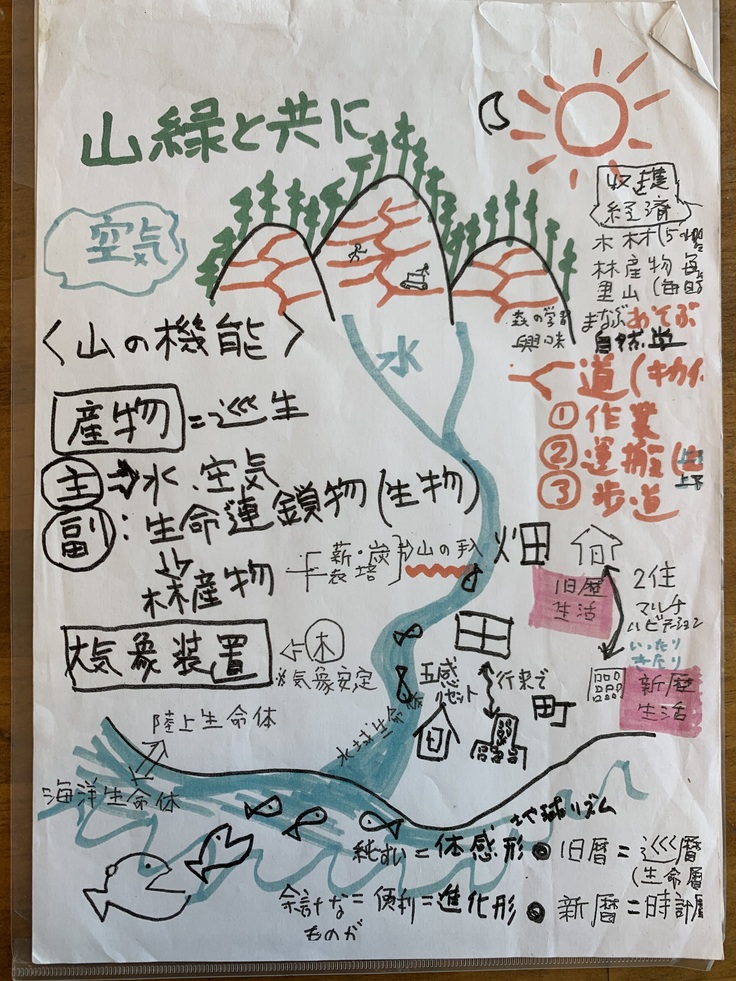 (薪文化さんから頂いた、自作の山と環境と暮らしの循環を表したイラスト。旧暦や新暦といった、経済優先の時間軸と自然の営みを軸とした暦にまで関係性を広げて考えてらっしゃいます。)