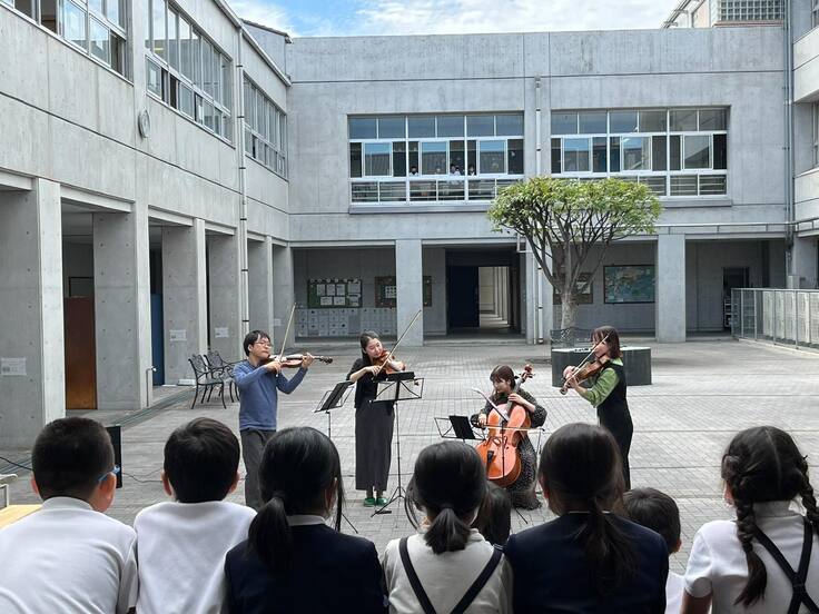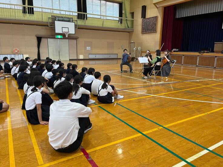 音楽の特別授業では、弦楽四重奏の仕組みや、音楽の成り立ちについて、総合プロデューサー小島燎のトークと実演を交えながら。