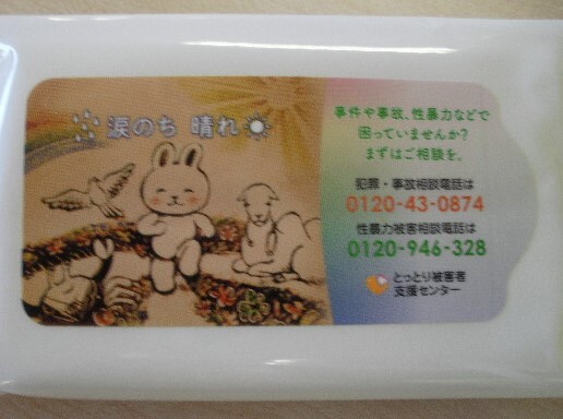 公益社団法人とっとり被害者支援センターが、11月にテレビCMを放送するとともに、10月までに街頭広報用ノベルティーグッズ(ウェットティッシュ)を製作し、街頭広報などをする際にチラシなどとともに配布します。 ・テレビCM放送料 66万円 ・街頭広報用ノベルティーグッズ(ウェットティッシュ)製作費 24万円 ・通信費 5.4 万円 ・クラウドファンディング取扱手数料 14.6 万円