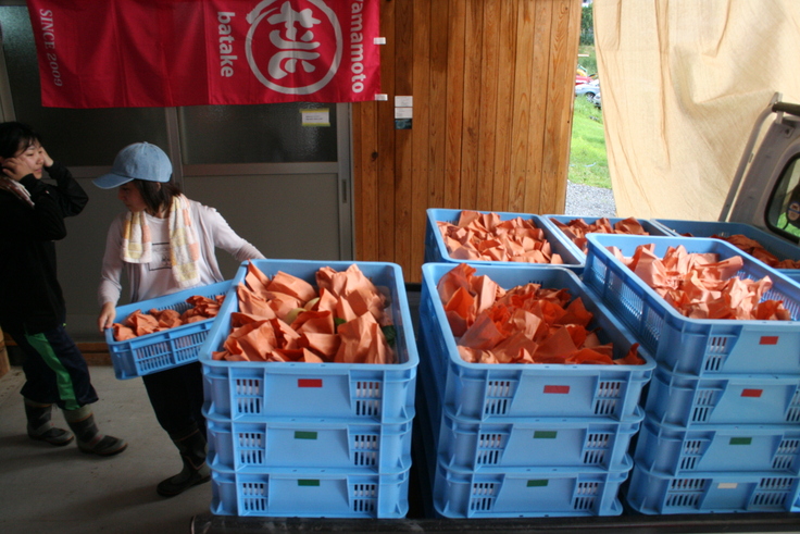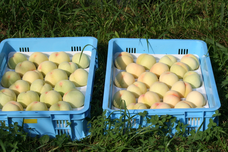 収穫は、パート、学生の方々総出で比較的涼しい6時頃から9時、10時頃まで行います。ピンクのノボリは収穫期間中に白桃があれば掲げており、直売もしています。
