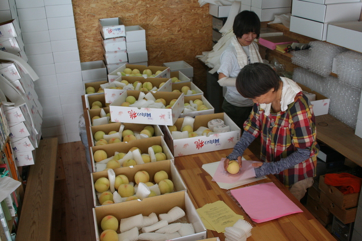 作業場の中では、大きさや傷の有無等でランク分けしてすぐに出荷します。北海道や沖縄等を除き、翌日には到着します。これが傷みやすい白桃の産地直送の強みです。