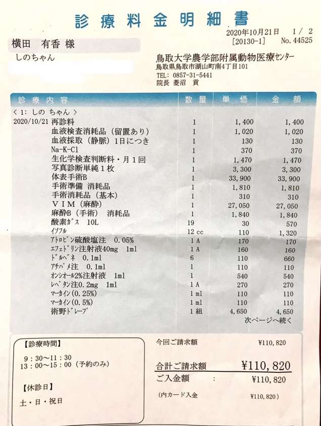 シノちゃんは鳥取大学動物医療センターで「先天性の鎖肛」という障害と診断され、至急、手術を受けました。