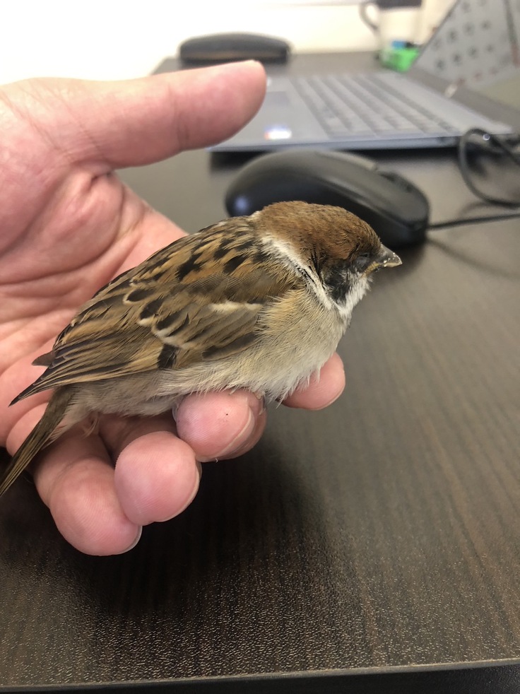 本日、出社したところ1羽のスズメが会社の玄関マットの上でで蹲っていました。