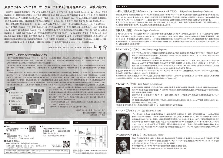 後援:駐日韓国大使館 韓国文化院 群馬県、高崎市、上毛新聞社、群馬テレビ、FM GUNMA、群馬楽友協会、高崎国際音楽協会、チェコ共和国大使館、チェコセンター東京 東京プライムシンフォニーオーケストラ 一般社団法人