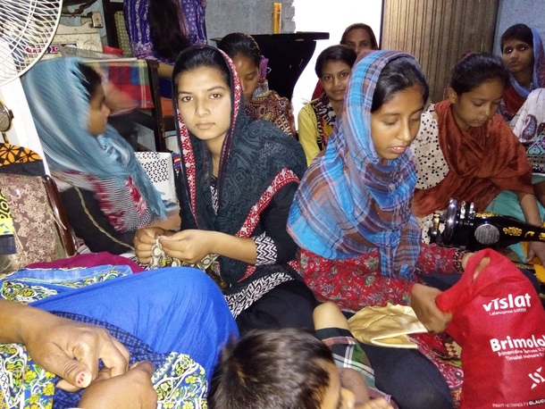 ※オープンして間もない縫製技術学校ですが、そこに通う女性たちが初めて挑んだ手づくり巾着袋です。布は、パキスタン製コットン生地の余り布や切れ端を使いました。