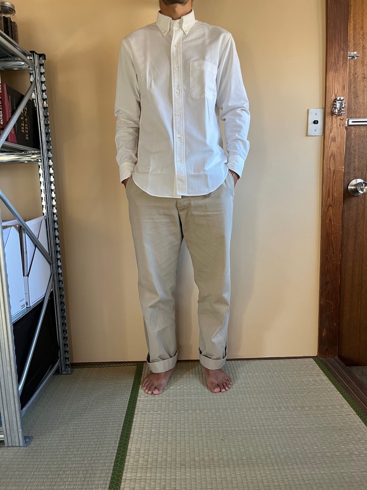 ※世の中でマスターピースと呼ばれる定番服(傑作)を坂ノ下の習慣(※サカトラ) x 育てる(経年変化)服に再構築。ビーサン&黒縁メガネがコーディネイトのお供。 ※サカトラ:サカノシタトラディショナルの略