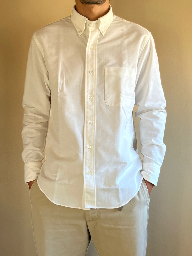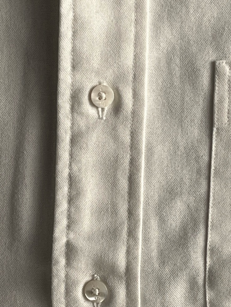 オックスフォードクロスの王道糸番手[経『たて)糸40/1x緯(よこ)糸10/1]を使用した糸密度設計をベースに、経(たて)糸密度を20%増量して手持ち感のしっかりとした高級感と、ヴィンテージ古着のような油分の抜けたナチュラルな風合いを出すために緯(よこ)糸は強撚糸を使いドライタッチに仕上げています。