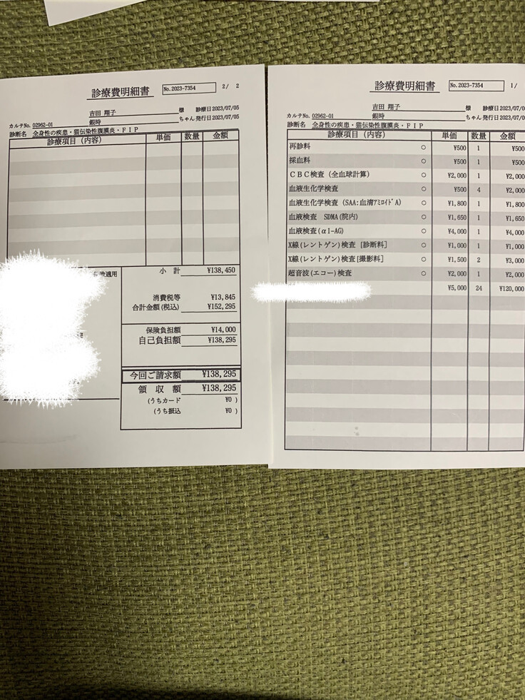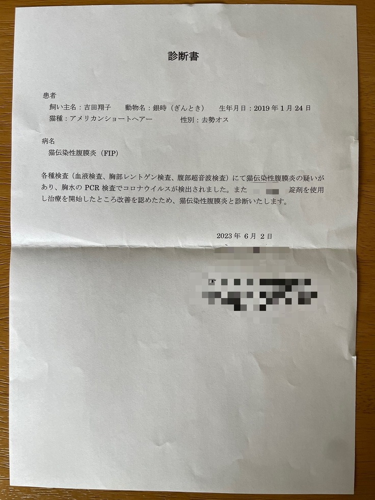 先日、過呼吸のような状態が続いていた為、かかりつけ医に連れて行くと、猫伝染性腹膜炎(FIP)という病気に罹っていることが判明しました。