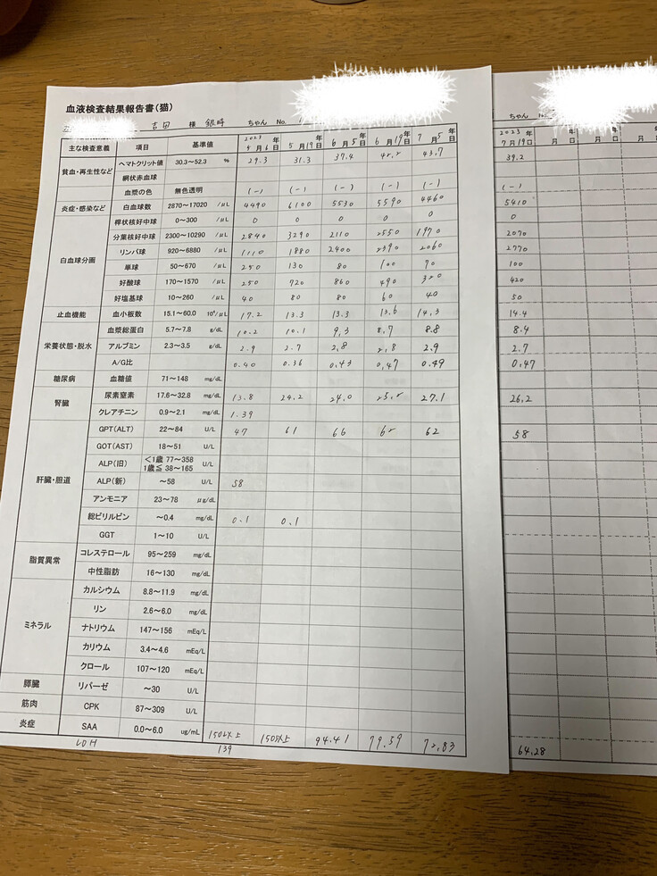 胸水が大量に溜まっており、常に溺れている感覚と変わらない・肺が1/4になっており助けれないと言われましたが、胸水を300ml抜いてもらい、なんとか持ち堪えてくれました。
