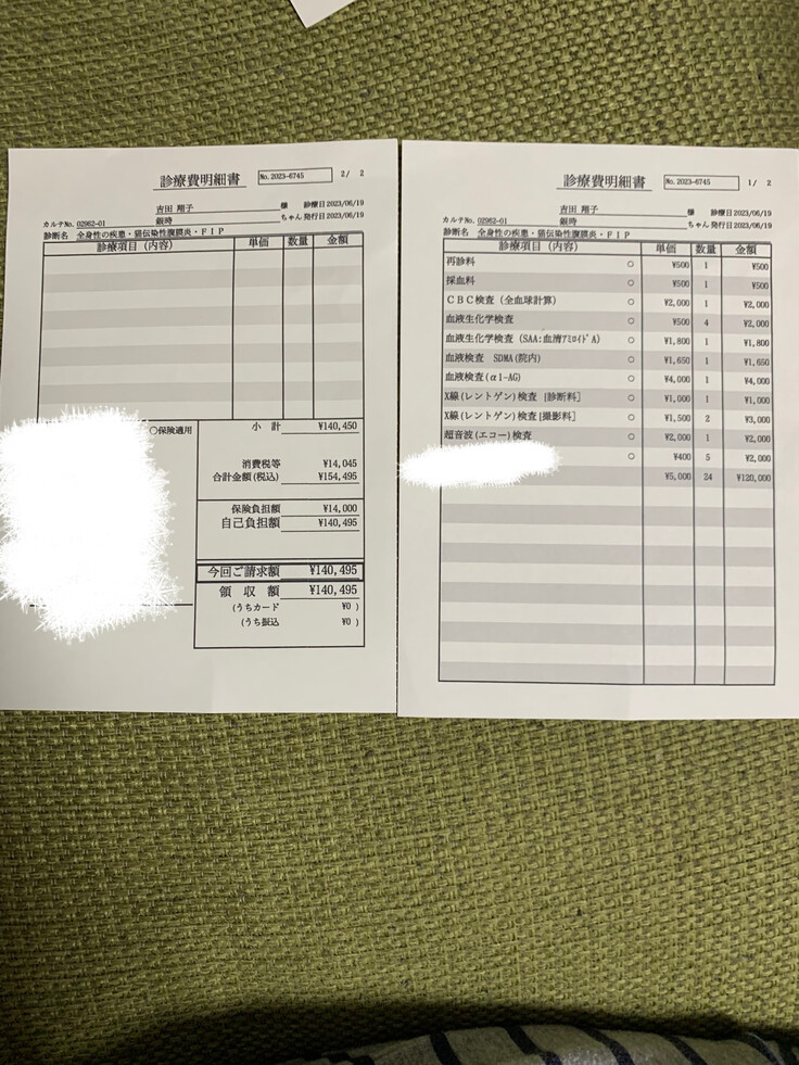 治す為には、海外の薬を84日間投与する事が必要で、それにより全快する猫ちゃんも多いとの事です。