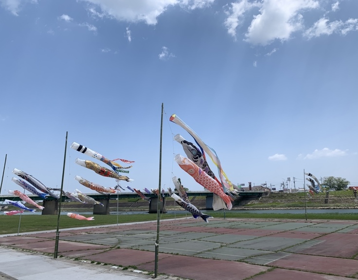 (先日、この町でさまざまなイベントやフェスが行われる河川敷に、みんなで鯉のぼりを見に散歩に行きました。独立した自治体のため、積極的に町外からの事業や移住を見込んで、町を上げたイベントが行われています。)